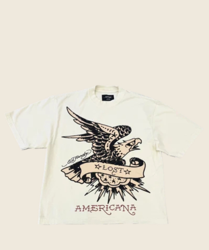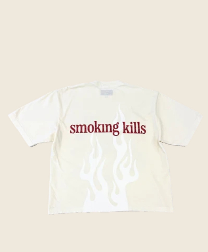 This MGK x Ed Hardy boxy tee is cut from a 7.5 ounce 100 percent heavyweight cotton in the shade cream. Embellished with rhinestones and features an iconic Lost Eagle graphic on the front. Complete with an MGK “Smoking Kills” graphic on the back and a wide rib neck.